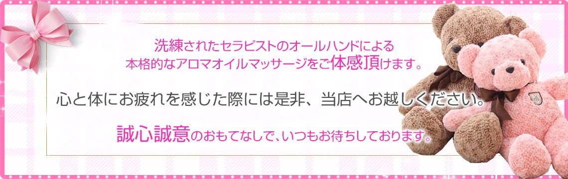当店は、厳選されたセラピストのみで構成されたリラクゼション店です。端麗な容姿・洗練された技術・真心からのおもてなしで、お時間の許す限り最高級のサービスをご提供いたします。寛ぎの雰囲気の店内で、心には潤いと安らぎを、体には充足感と活力を、セラピストがお届けします。「また来たい。」と本当に思われるようなお時間をご堪能いただけるよう、お店作りに励みたいと思う所存です。どうぞよろしくお願いいたします。